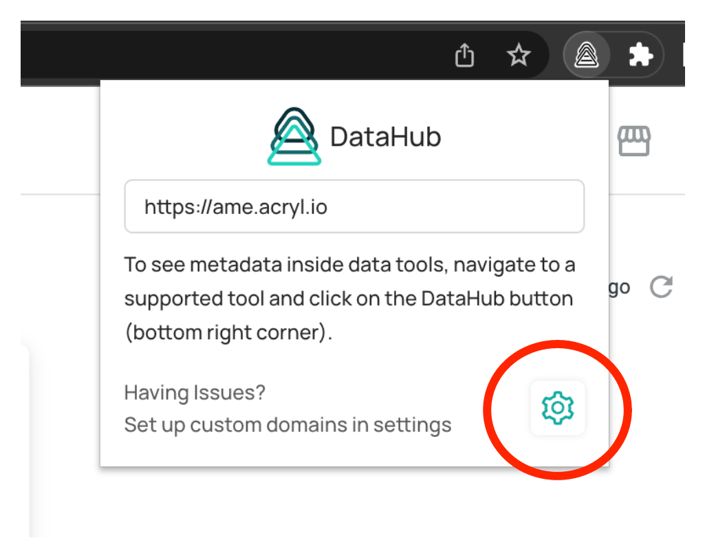 1. Click on the extension button and select your DataHub extension to open the popup again. Now click the settings icon in order to open the configurations page.